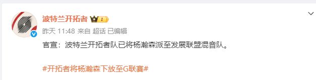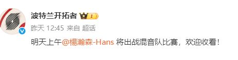 之后波特兰开拓者官宣,将杨瀚森派至发展联盟混音队,杨瀚森将出战12月5日上午的比赛。