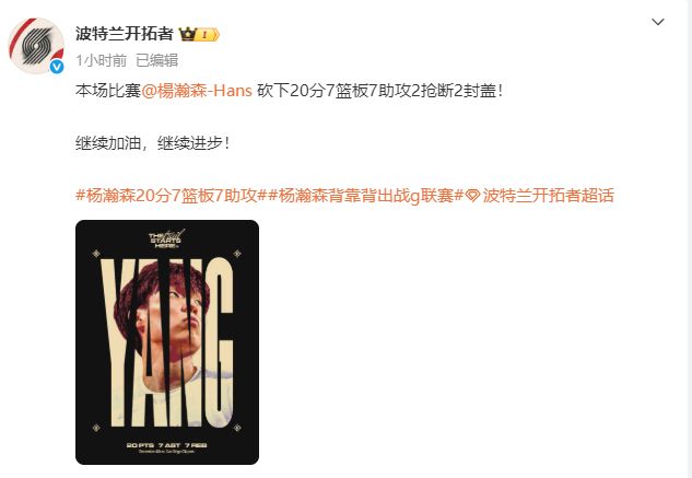本场比赛结束后,波特兰开拓者发文鼓励杨瀚森:继续加油,继续进步!